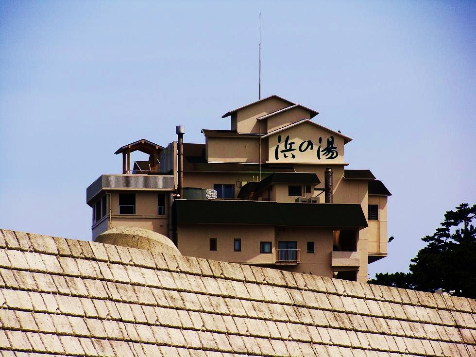 ■防波堤から『浜の湯』が見えます。左に見える櫓は露天風呂です。