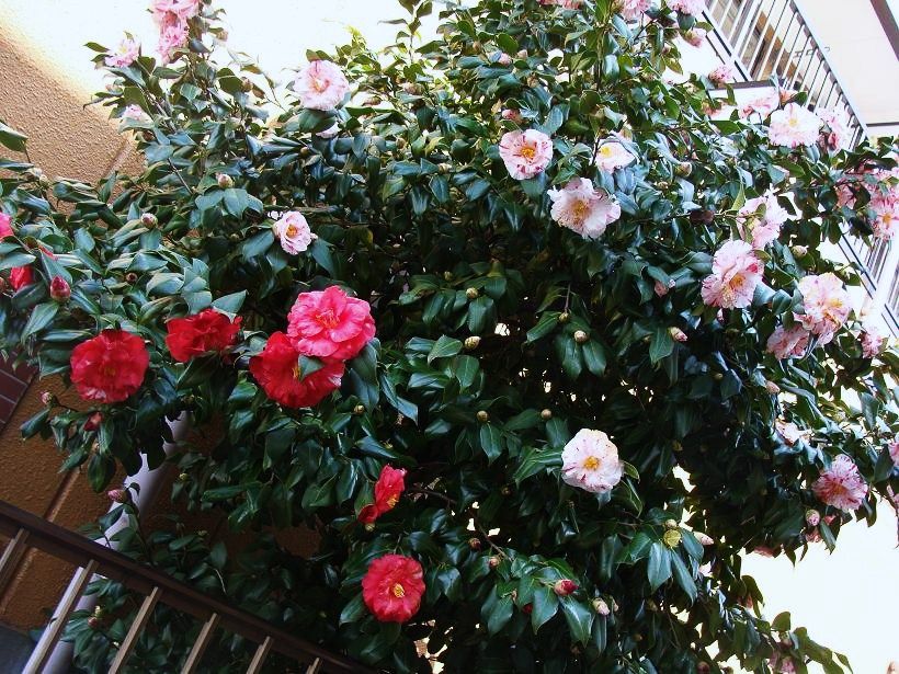 ■この椿不思議です。白+ピンクと赤い花が1本の木から咲いてます。